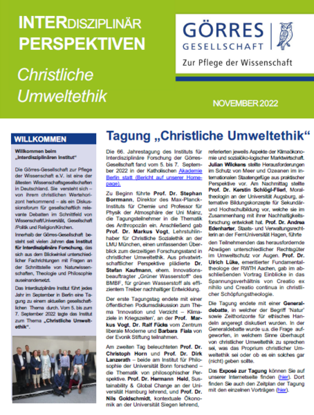 Vom 5. bis zum 7. September 2022 führte das Institut für Interdisziplinäre Forschung (kurz: Interdisziplinäres Instituts) der Görres-Gesellschaft seine 66. Jahrestagung durch. Diese stand unter dem Thema "Christliche Umweltethik". Den Newsletter zur Tagung können Sie hier aufrufen. Er gibt einen Überblick über die gehaltenen Vorträge sowie die Podiumsdiskussion und verschafft so einen Einblick in die Arbeit des Instituts, die im kommenden Jahr, vom 13. bis zum 15. September 2023, mit einer Tagung zum Thema "Risiko und Vertrauen" fortgesetzt wird.
